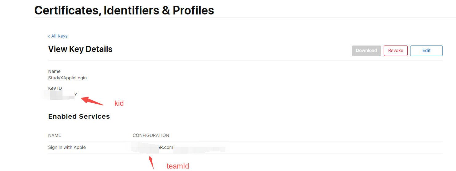 After configuring the Services ID, create a Key. When creating the Key, enable Sign in with Apple and associate it with your App ID.